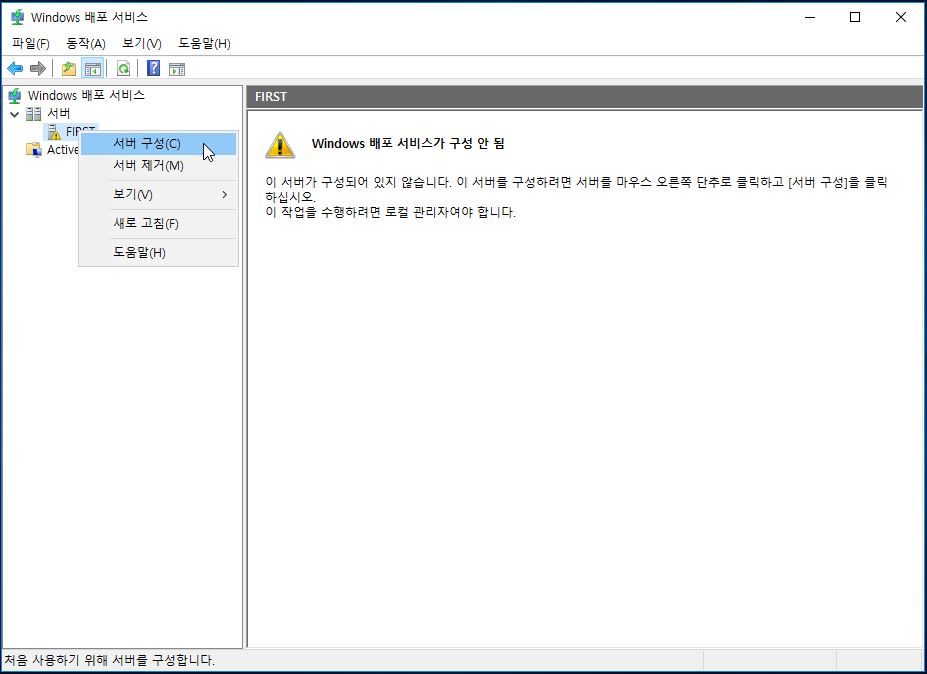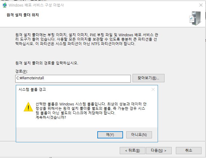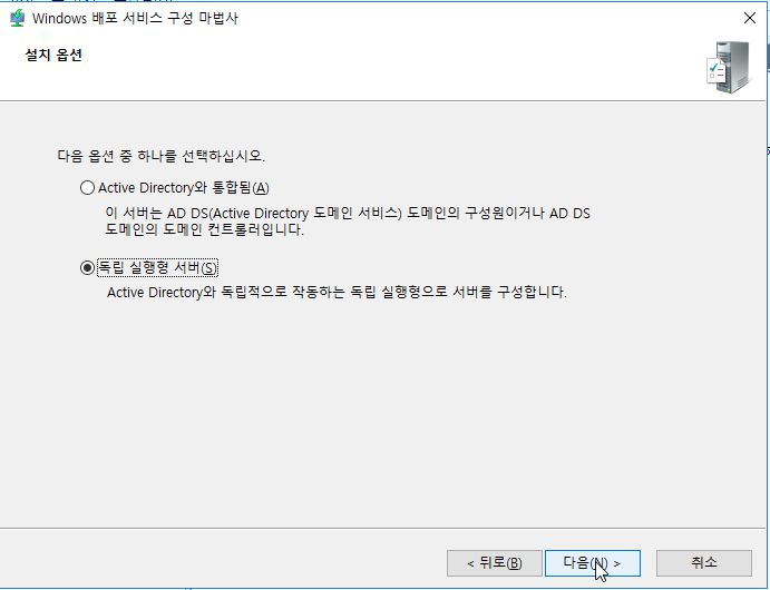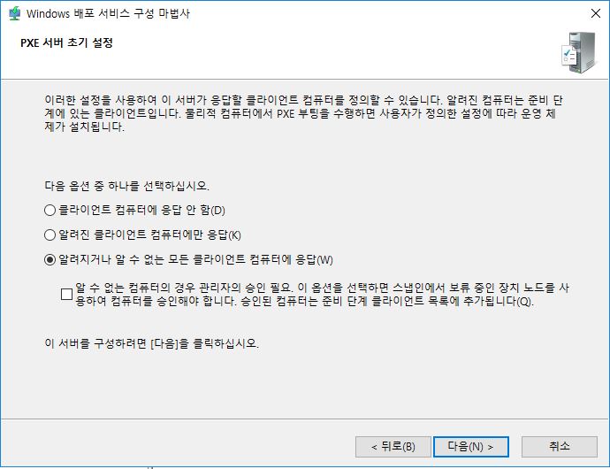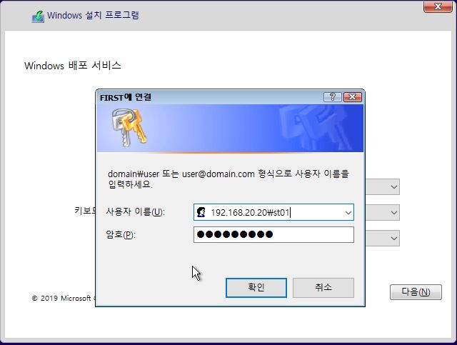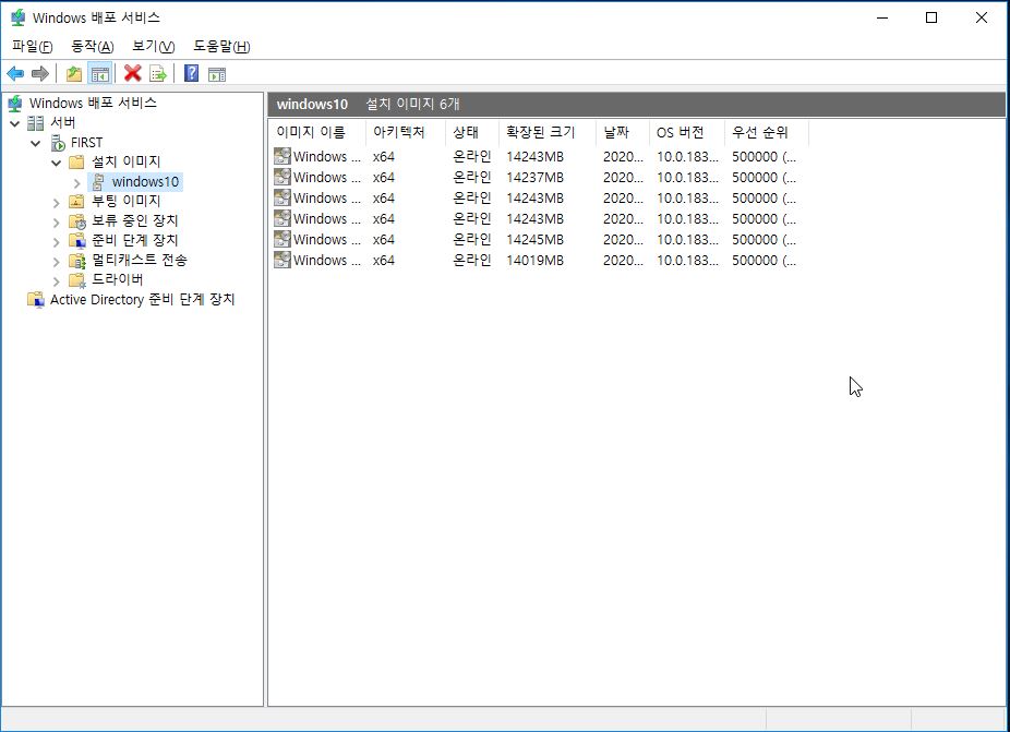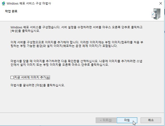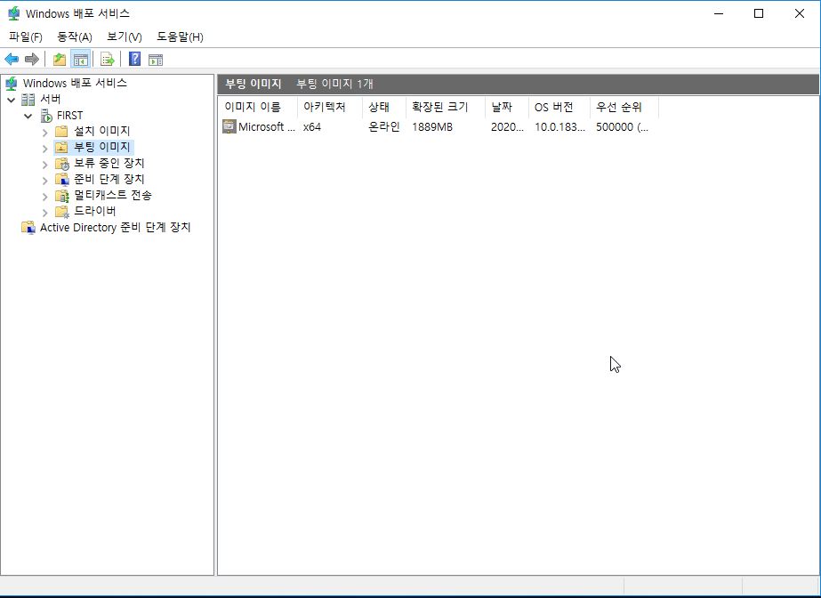 서버에서 Windows 배포 서비스 기능을 추가하고 관리 화면으로 들어옵니다. 독립 실행형 서버를 선택합니다. 다음을 누르면 경고창이 뜨는데 예를 눌러줍니다. 마지막 옵션을 선택 합니다. 체크를 풀고 마침을 클립합니다. VMware에서 가상머신을 설정합니다. 가지고 있는 iso파일을 찾아서 넣어줍니다. 여기서는 windows10 이미지를 사용했습니다. 윈도우 서버로 돌아와서 부팅 이미지를 추가해 줍니다. 파일 위치는 사진과 같으며 D드라이브는 CD롬입니다. 이미지 메타데이터를 설정하는 화면입니다. 이 이미지의 이름은 나중에 클라이언트가 배포서버를 이용해 OS를 설치 할때 볼수 있습니다. 다음을 계속 클릭해 추가를 완료 하면 리스트에서 확인할 수 있습니다. 부팅 이미지 추가를 완료했다면 설치 이미지를 추가해 줍니다. 그룹을 만들어 줍니다. 그룹을 이용해 추후에 다른 OS(예를 들면 리눅스)를 추가할때 새로운 그룹을 만들면 여러가지 OS 설치를 할수 있도록 할수 있습니다. 설치 파일을 찾아 설정해 줍니다. 다음을 계속 클릭해 추가를 완료 하면 리스트에서 확인할 수 있습니다. 테스트를 위해 가상머신을 새로 하나 만들어 줍니다. 기타 장치와 CD롬도 제거해 줍니다. 이미지 없이 부팅하면 이런 화면이 뜨는데 F12를 눌러 배포 서버에 접속해 설치를 할수 있습니다. 저렇게 떠서 멈춘다면 esc키를 누르면 재검색 하는데 그때 F12를 눌러 들어갈 수 있습니다. 이 화면이 뜰때도 있고 안 뜰때도 있는데 이 화면은 위에서 부팅 이미지를 추가할때 설정했던 이미지 메타데이터 이름입니다. 파일 로딩이 끝나면 windows10 설치 화면으로 접속 됩니다. 여기서 부턴 일반적으로 os를 설치하는 것과 같습니다. 사용자 이름 형식은 위에 나와있는 2가지 형식 중 한가지에 맞춰 적어주면 됩니다. domain부분에는 윈도우 서버의 컴퓨터 이름을 적어도 됩니다. 'System > Windows Server' 카테고리의 다른 글