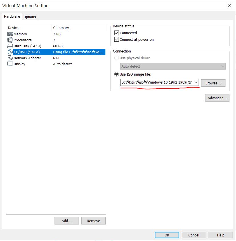 가지고 있는 iso파일을 찾아서 넣어줍니다. 여기서는 windows10 이미지를 사용했습니다.